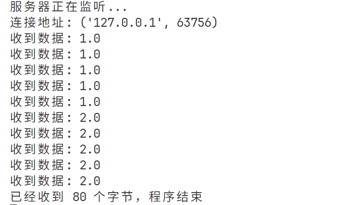 上述代码中,规定当 num 超过80也就是发送10个数据之后就返回而不继续发送数据。同时前5个数据是1,后5个数据是2。接下来检验效果。Python 服务端代码如下: